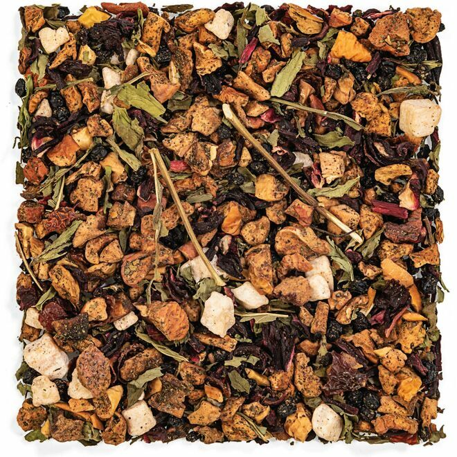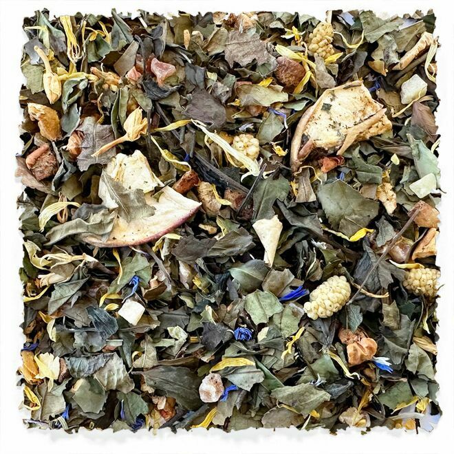 Ingredients: Apple, hazelnut leaves, lavender, sunflower, rosehips, rose petals, mallow blossom, marigold blossom, peppermint, pear, papaya, pineapple, mango, dates, natural flavor, figs, red currants, tartaric acid