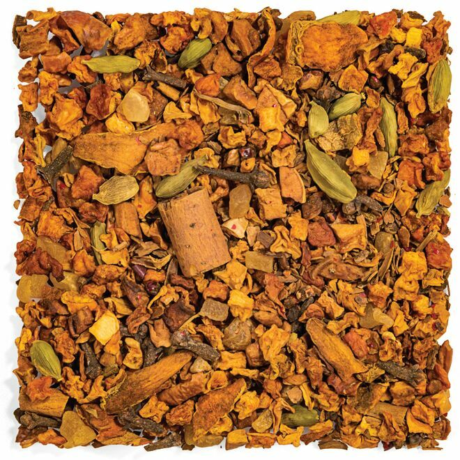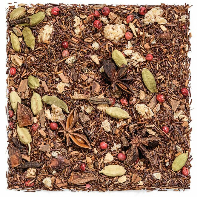 Ingredients: Rooibos, cinnamon, ginger, cloves, cardamom, fennel, pink pepper, aniseeds, natural flavor