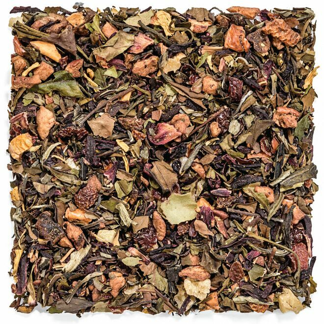 Ingredients: White tea, apple, pear, hibiscus, rosehips, pineapple (sugar), cinnamon, natural flavor, sunflower